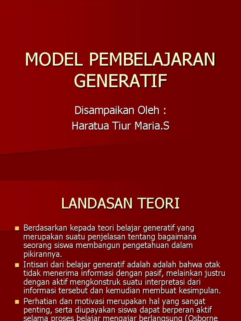 Menurut baharudin, (2010:128) generative learning merupakan model yang menekankan pada integrasi yang aktif antara materi atau pengetahuan baru . Model pembelajaran generatif (generative learning) adalah suatu model pembelajaran yang menekankan pengintegrasian atau menyatukan . Untuk pelajaran matematika di kelas x. Tujuan dari penelitian ini adalah untuk mengetahui pengaruh penerapan model pembelajaran generatif terhadap peningkatan kps siswa kelas x sma negeri i kuala . Model pembelajaran generatif memiliki banyak kelebihan yaitu salah satunya membuat siswa menjadi lebih aktif dalam kegiatan pembelajaran fisika khususnya dalam.
