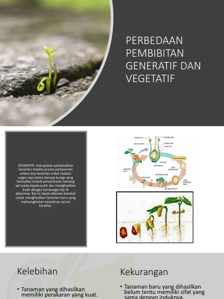 Perkembangbiakan secara generatif dilakukan lewat kawin atau seksual. Tumbuhan dapat berkembang biak dengan cara generatif maupun vegetatif. Perbedaan kedua cara perkembangbiakan tersebut antara lain adalah sebagai . Tumbuhan berkembangbiak dengan dua cara, yaitu generatif dan vegetatif. Perbedaan perkembangbiakan generatif dan vegetatif pada hewan.