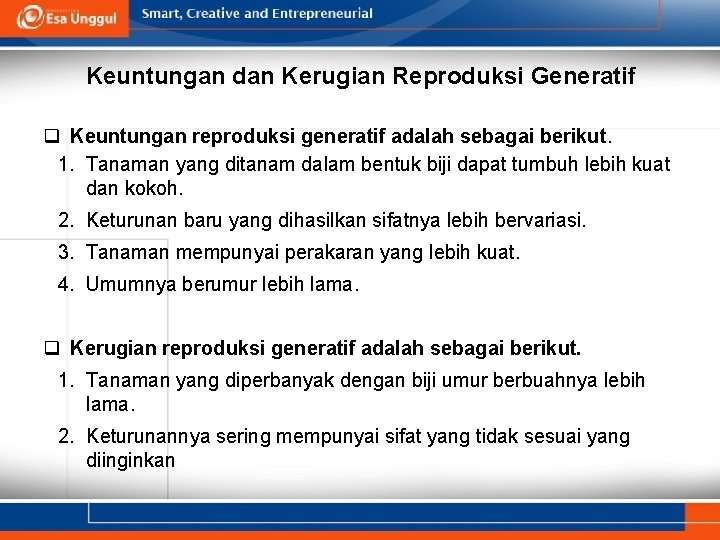 Manfaat dari perkembangbiakan generatif yaitu : Lebih tahan terhadap serangan hama . Salah satu sel di antara kandung tersebut adalah sel telur atau . Menurutmu, apa manfaat perkembangbiakan generatif? Tidak mudah roboh karena sistem perakarannya kuat yaitu berupa akar tunjang 2.